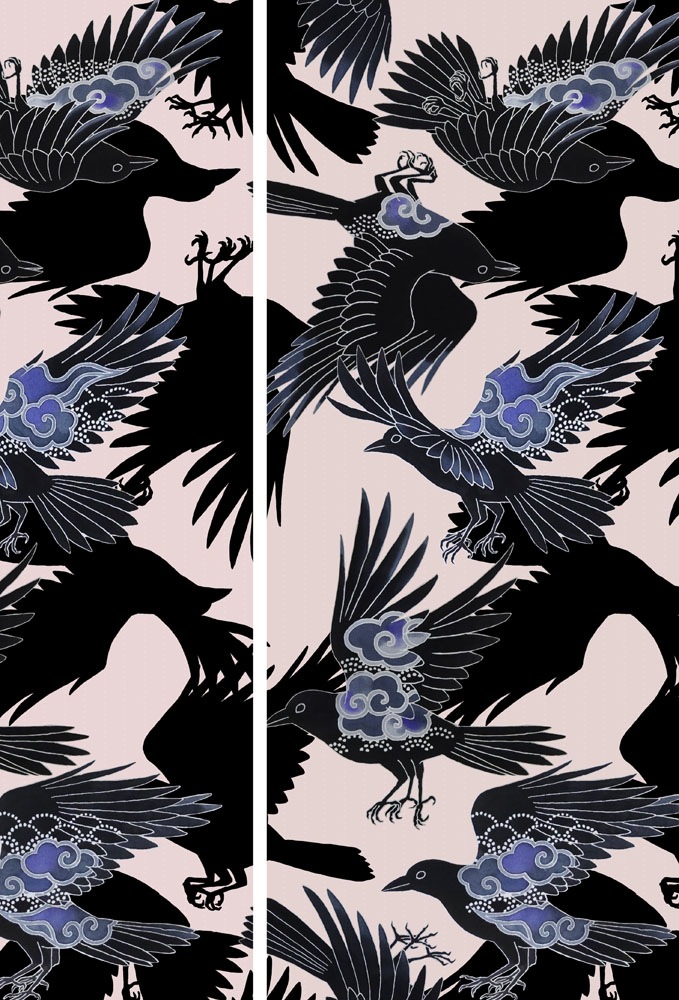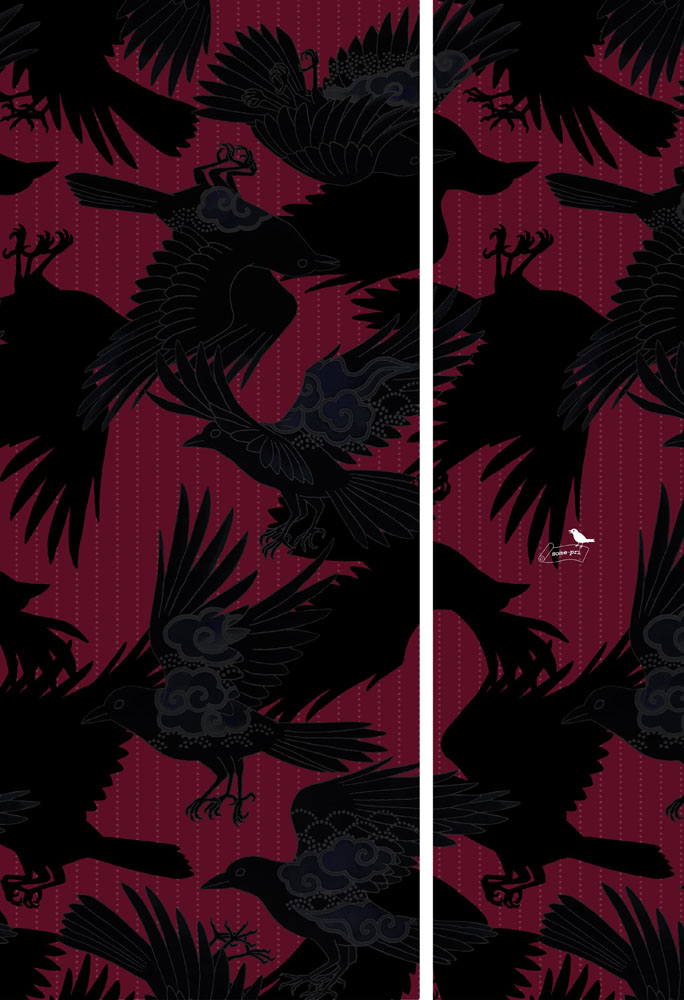 「雲八咫烏 桜鼠×エンジ」セオα単衣 片身替わり絵羽着物雲文様を羽根の意匠にしたヤタガラスを描きました。地色は濃淡の片身代わりになっています。浴衣としてはもちろん、着物としてのコーディネートが広がるデザインです。セオα単衣絵羽着物は、盛夏は浴衣としてもご着用頂けます。ご自宅でお洗濯ができます。雨の日にも安心です。