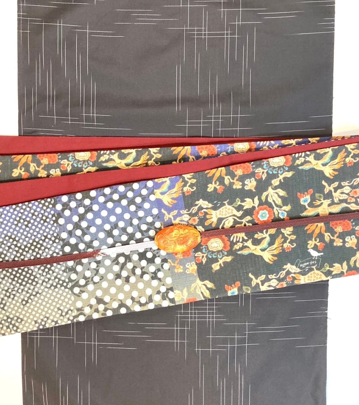 サラッとした手触りの綿紅梅にプリントしました。カジュアルな着物によく合い、通年でお使いいただける半幅帯です。