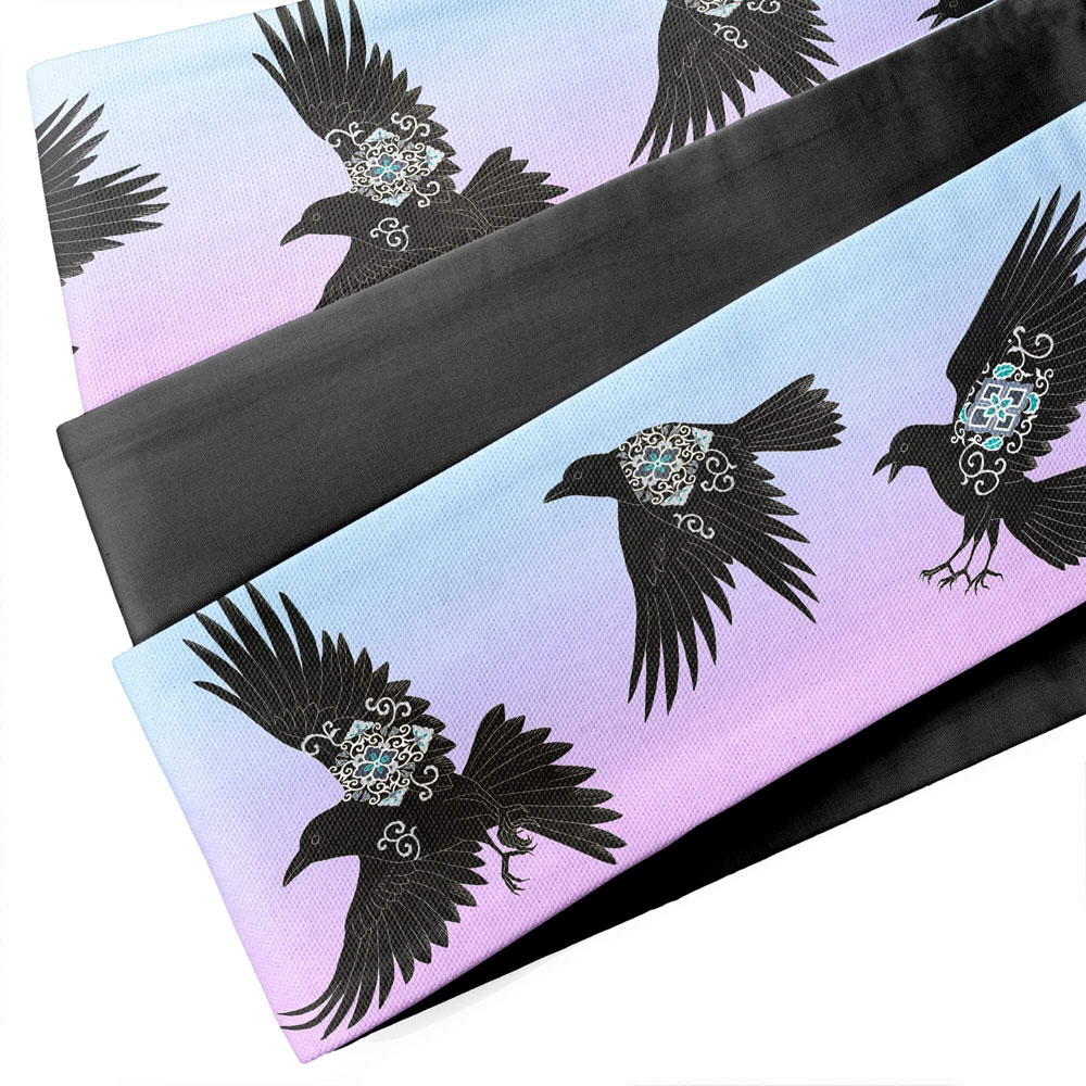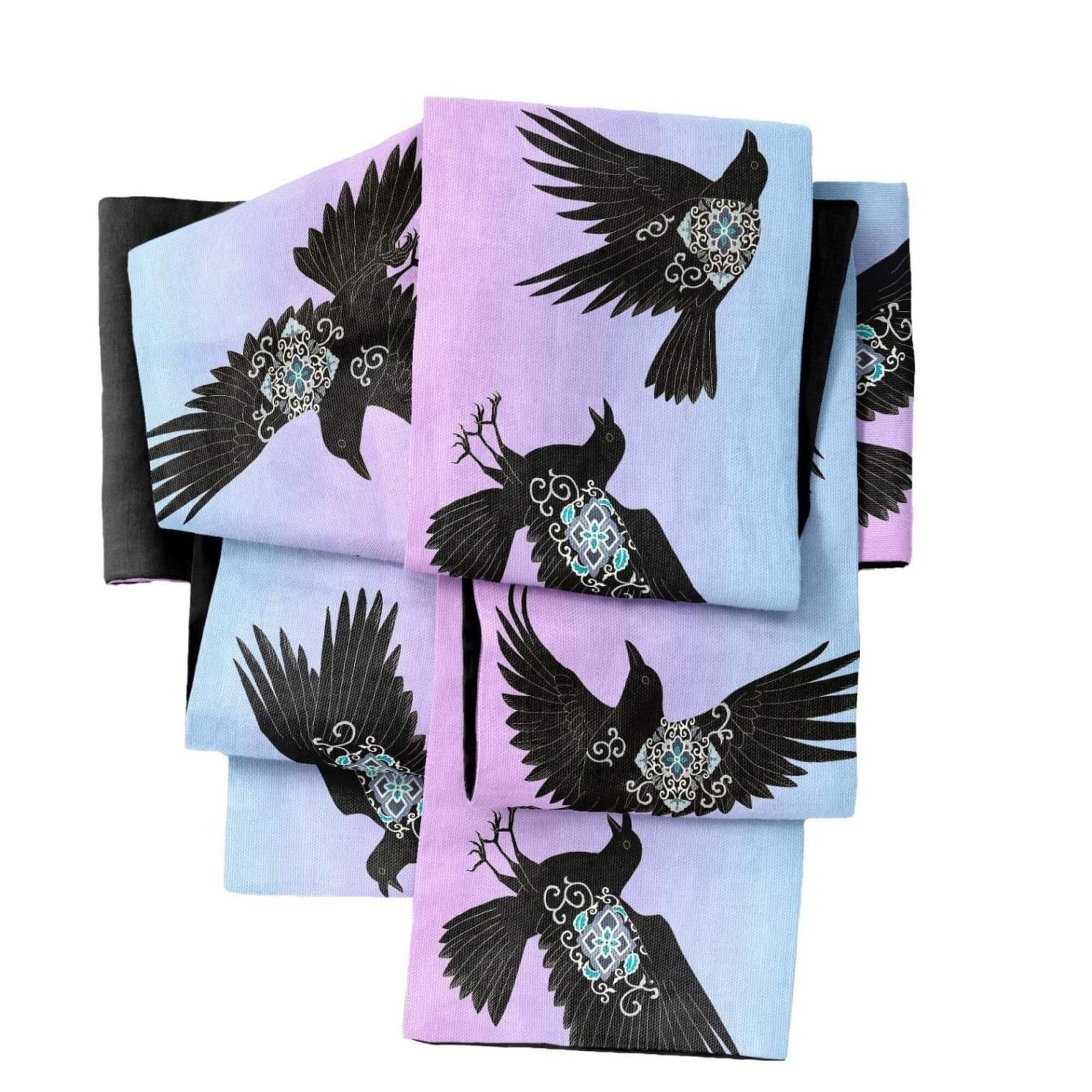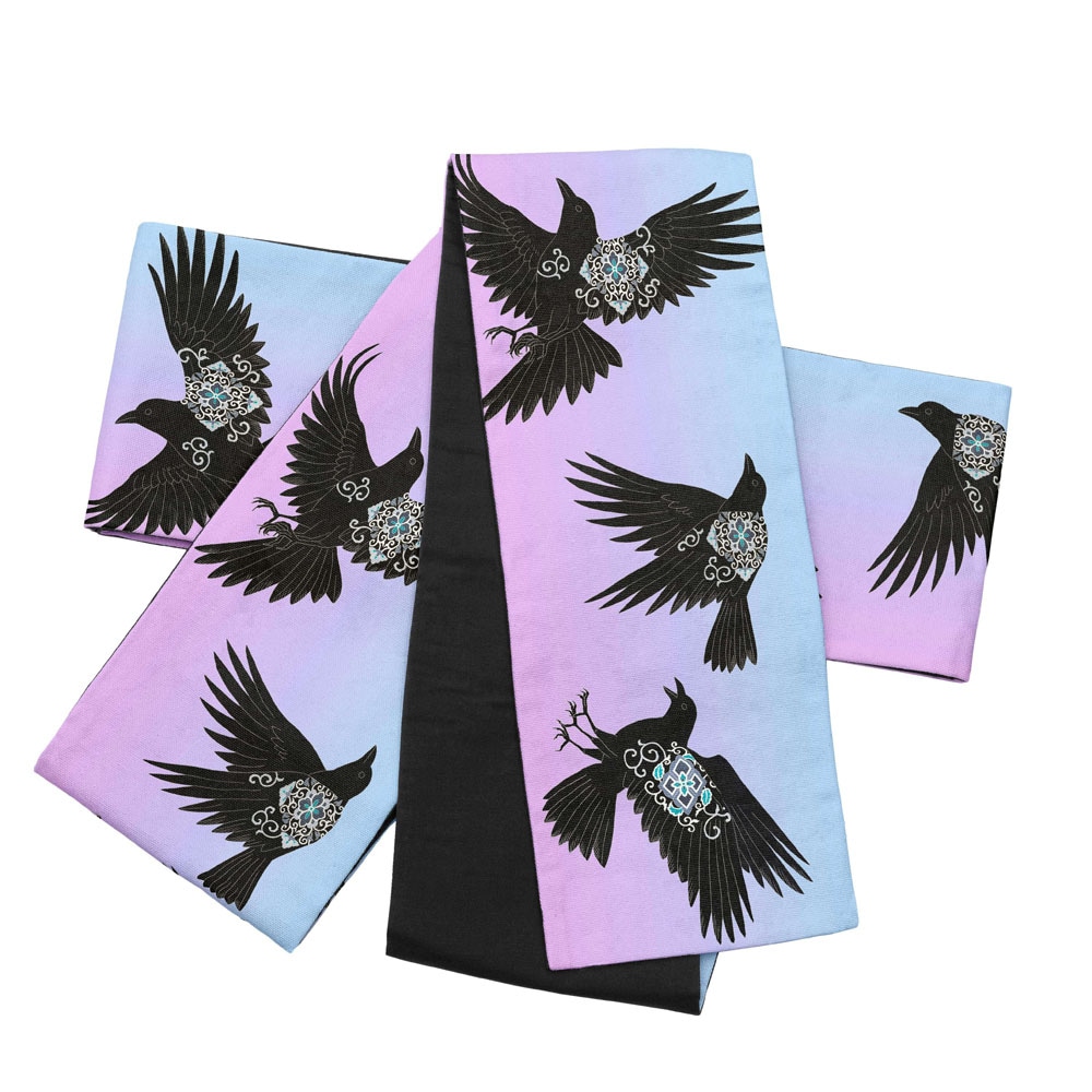 ユキヤオリジナルデザインのヤタガラスを半幅帯にプリントしました。カラスたちの体の紋様は、濡羽色を意匠的に表現したものです。