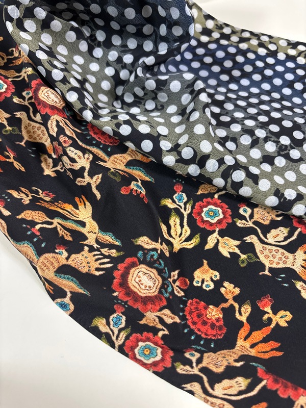 "帯あげ"という和装のアイテムを元に友禅職人がストールを考えました!柄は友禅染で染めた生地をデザインした模様と組み合わせ、プリントしています。
